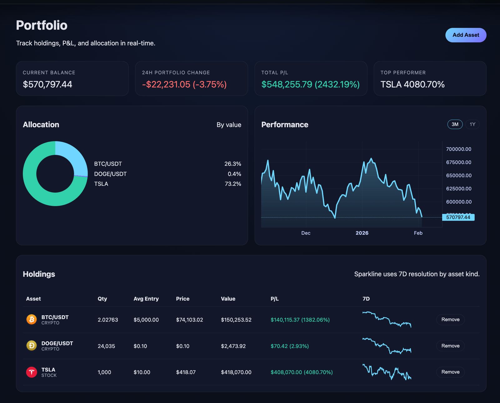 A quick 7-day sparkline per asset so you can read momentum instantly