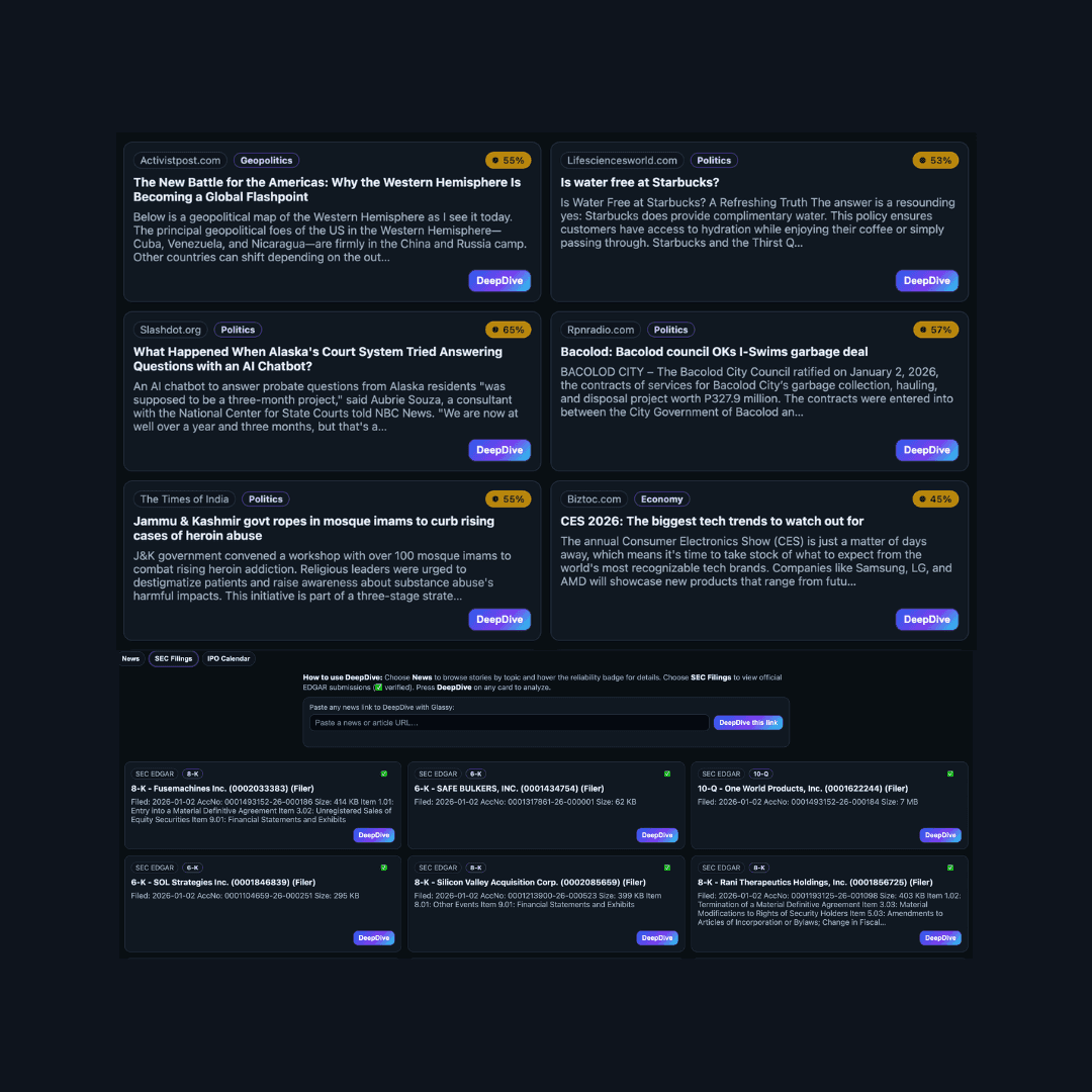 SEC filings, decoded. From 8-Ks to 10-Qs, DeepDive pulls the signal out of the legal noise - with key changes, risks, and what to monitor next.