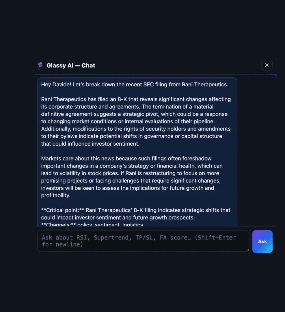 Meet Glassy - your market-native copilot. Glassy lives inside Tradeglass. It understands the chart, your analysis mix, and DeepDive context - so you can ask better questions and get actionable answers.