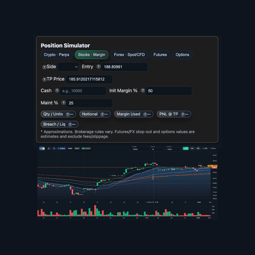 Before you place a trade, simulate the position. Estimate sizing, margin, liquidation/breach levels, and P&L at targets - across multiple instrument types.