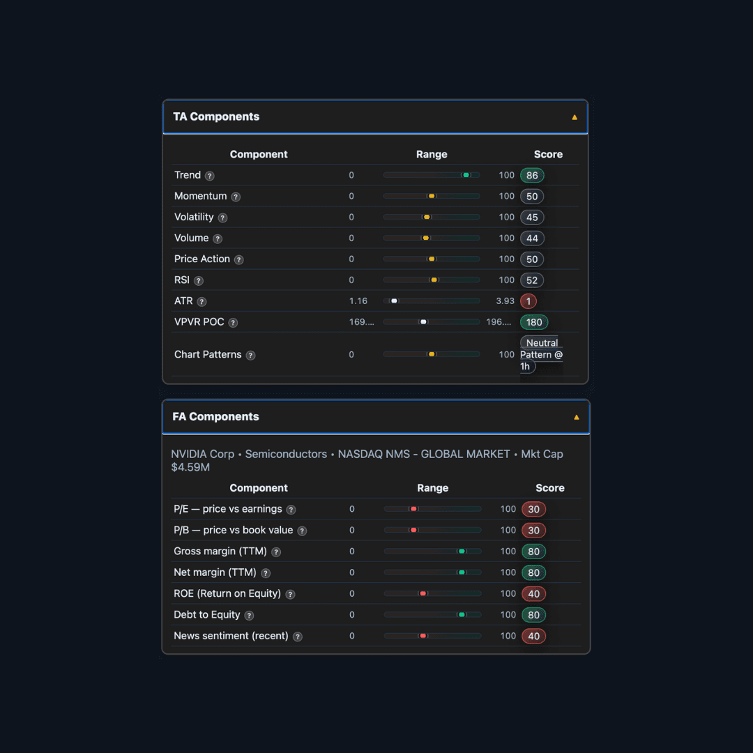 (TA Components + FA Components). Not a black box: component-level explainability. Every Tradeglass score decomposes into components you can understand and validate. Use it as a decision aid, not a mystery.