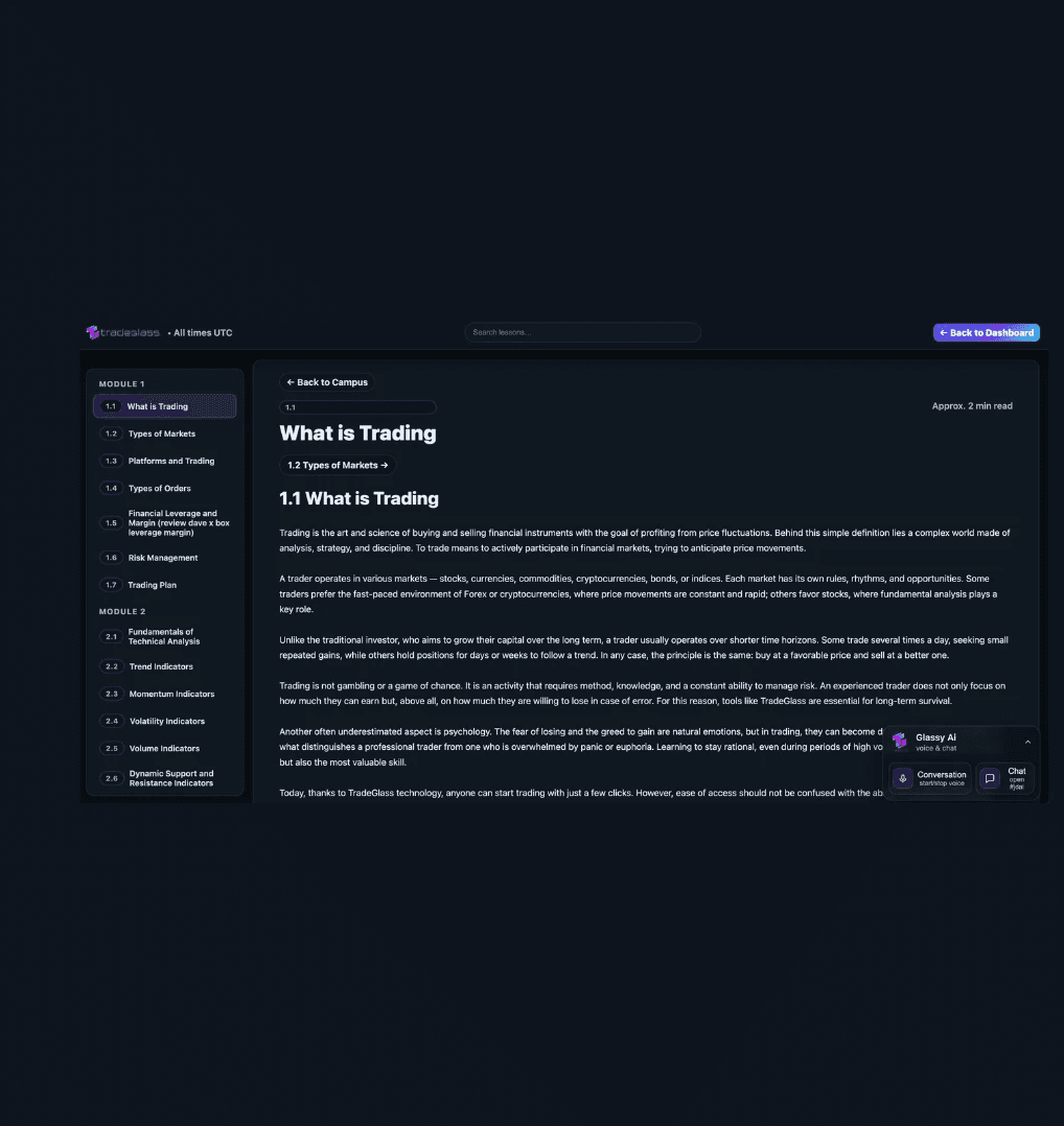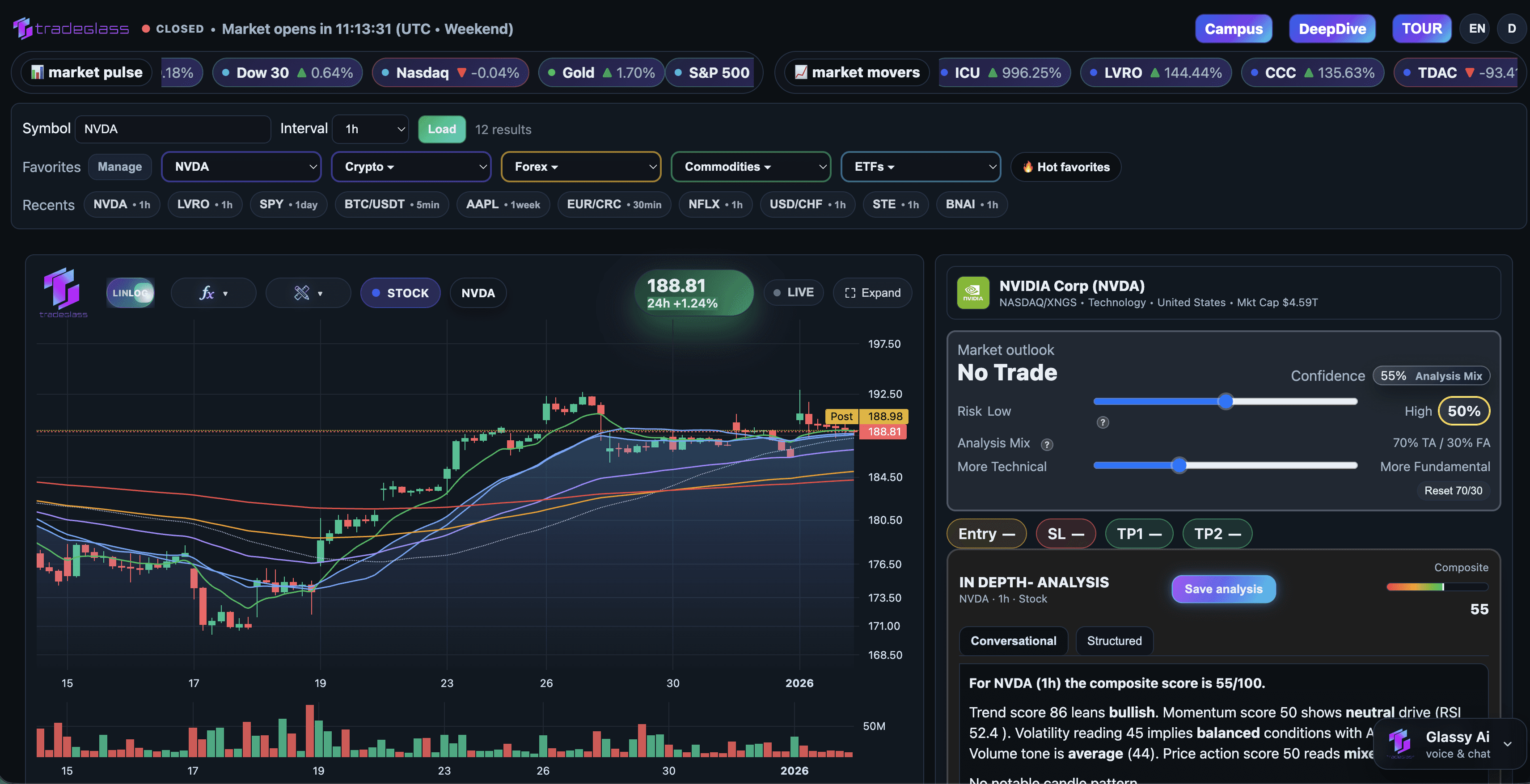 Tradeglass fuses technical structure and fundamental context then adds a game-theory layer for crowding and asymmetric risk. Get a clear stance (Long / Short / No Trade) plus the “why” in plain English with DeepDive and Glassy (voice + chat).